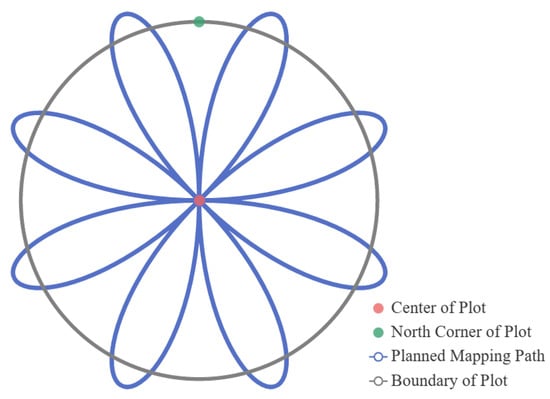 This study experimented with a circular plot with a diameter of 7.5 m (the area was 177 m2). The measurement route of the plot was the sunflower path (see Figure 8). This path starts from the center of the plot, heading towards the north, and then measures the trees in each petal area in a clockwise direction, returning to the plot’s center after measuring one petal area. To ensure the exact position of the plot center, a marker (an object used for marking) is typically placed at the plot center before starting the measurement task, with the marker pointing towards true north (Figure 9a). This research also uses an array camera as the observation sensor. However, global position optimization is performed by recognizing the marker each time the plot center is passed. Therefore, the sunflower path optimizes the position by passing through the plot center multiple times and obtaining a globally consistent plot map.