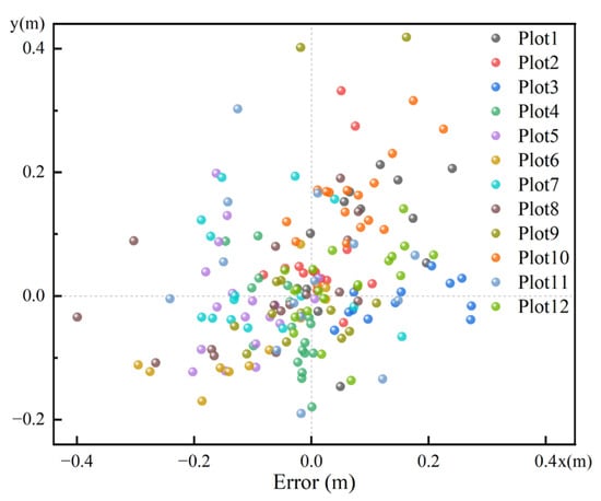 The results showed an average error range in the x and y directions of about −0.11 m to 0.16 m. Table 2 examines the average bias and root mean squared error in the x and y directions. The average X-BIAS for each plot ranged from −0.11 m to 0.16 m, with an overall average of −0.01 m, while the average Y-BIAS ranged from −0.07 to 0.15, with an overall average of 0.03 m. These results indicate some systematic biases in the estimated stem positions relative to their actual positions, but they are relatively small. The average values of X-BIAS and Y-BIAS are close to zero, which is a positive sign. The average X-RMSE is 0.12 m, while the average Y-RMSE is 0.11 m. The RMSE values are relatively consistent in the X and Y directions, suggesting a uniform error distribution. Figure 10 and Figure 11 show the position errors for all plots. Although systematic errors exist in the estimated tree positions for each plot, the overall errors are minor, and the systematic errors vary randomly across different plots.