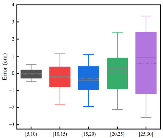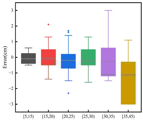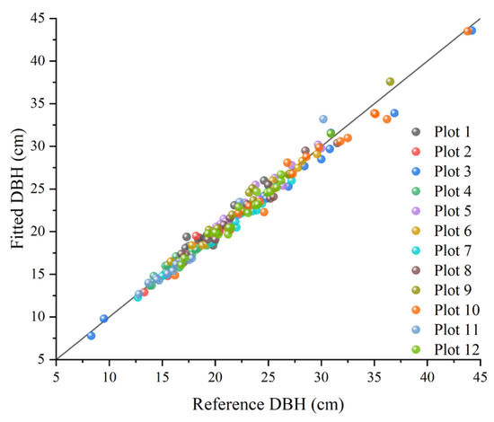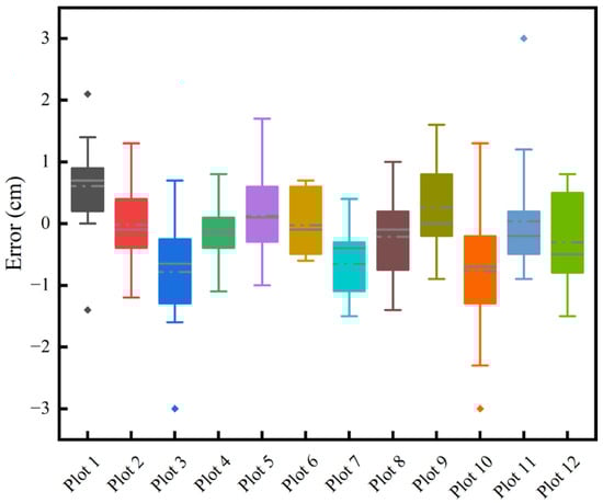 The DBH shows a BIAS that ranged from −0.78 cm to 0.61 cm, with the relative BIAS fluctuating between −2.98% and 3.22%, Table 3. The values of RMSE ranged from 0.46 cm to 1.24 cm, with the range of the relative RMSE being 2.33% to 5.3%. There is some deviation in the DBH estimation, but the percentage changes in relative bias and relative RMSE are within the limits. The RMSE also remains relatively low in different contexts, indicating a relatively high level of estimation accuracy. Figure 12 and Figure 13 indicate that the dispersion of measurement errors and observed values increases with the increase in DBH. Figure 14 shows that the error distribution between each plot’s measured and reference values is relatively uniform, and the distribution is random.