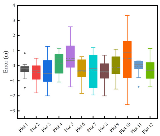 For tree height, BIAS ranged from −0.46 to 0.47 m, with relative bias varying between −3.97% and 1.87%, Table 4. The RMSE values fluctuated between 0.48 and 1.84 m, with the range of relative RMSE being 3.68% to 6.85%. As shown in Figure 15 and Figure 16, the dispersion of measurement errors and observed values gradually increases with the increase in tree height. Figure 17 shows that the error distribution between each plot’s measured and reference values is relatively uniform, and the distribution is random.