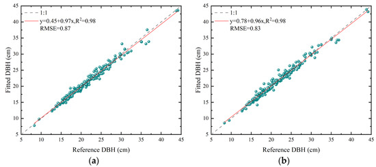 Scatterplot of DBH measurements using a steel tape measure versus DBH measurements using other methods. (a) Scatterplot of DBH estimates from reference [44]; (b) scatterplot of DBH estimates in this paper.