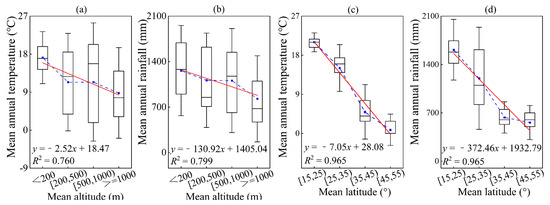 The variation in temperature and rainfall changing along with the average values of altitude and latitude. Among them, (a,b) altitude; (c,d) latitude; (a,c) temperature; (b,d) rainfall. The blue square in the box plot represents the average value. The red solid line is a linear fitting line.
