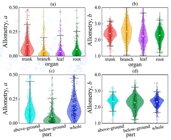 There was a significant negative correlation between parameter a and parameter b for different organs (Figure 4). This result has been widely observed [29,58,59,60]. It has been suggested that this correlation may be related to the plant’s mechanical load-bearing ability [58]. However, White and Gould argued that the relationship between parameter a and parameter b is due to the choice of measurement units or the algebraic equation itself and that no biological explanation can be deduced from it [59]. There is currently no plausible biological explanation for this negative correlation between scale factors, and it has been discussed less in other studies.