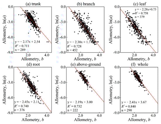 Relation between parameters a and b distinguished in different organs and parts. Among them, (a–f) represent the trunk, branch, leaf, root, above-ground, and whole, respectively. The red solid line is a linear fitting line.