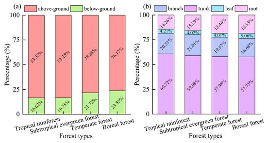 Percentage of biomass of different organs/parts of different forest types. Among them, (a) percentage of biomass of above-ground and below-ground; (b) percentage of biomass of trunk, branch, leaf, and root.