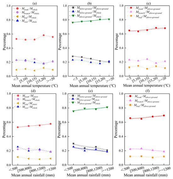 The effects of average values of temperature and rainfall on biomass allocation in different organs/parts. Among them, (a–c) temperature; (d–f) rainfall. The solid line is a linear fitting line.