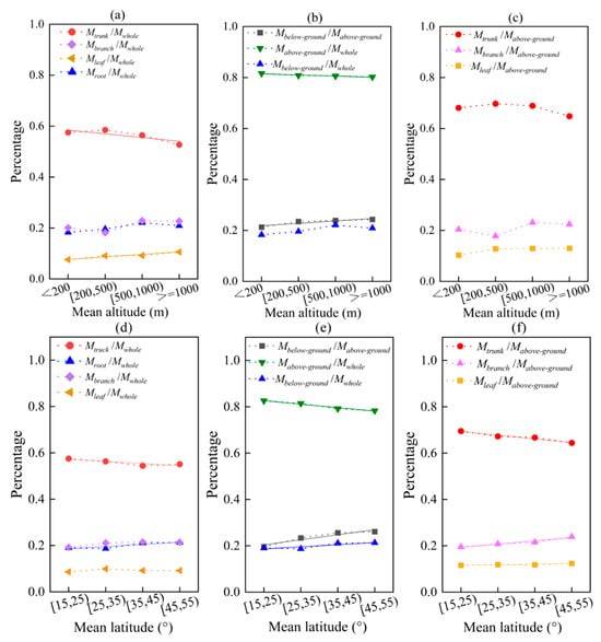 The effects of average values of altitude and latitude on biomass allocation in different organs/parts. Among them, (a–c) altitude; (d–f) latitude. The solid line is a linear fitting line.