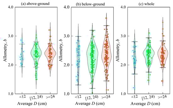 The change of the exponent of allometry with the size of the D. Among them, (a) above-ground; (b) below-ground; (c) whole.