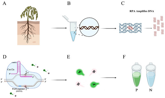 Flow chart of the RPA-CRISPR/Cas12a assay. (A) Host plants infected with P. nicotianae. (B) Extracting DNA from infected tissues. (C) Amplifying specific primers using RPA technology. (D) CRISPR/Cas12a-based editing. The Cas12a protein can bind to each amplicon and target specific crRNA, activating its cis-cleavage activity. (E) When the single-stranded DNA reporter gene labeled with FAM is cleaved, green fluorescence is visible at an excitation wavelength of 470 nm. (F) P represents a positive result: visible green fluorescence. N represents a negative result: no visible green fluorescence.