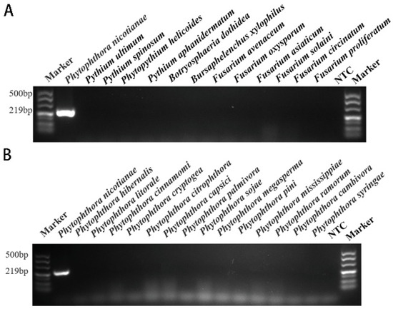 The results of conventional PCR screening for specific target genes. According to the primers designed based on the INRA-310 gene, specific screening was carried out using conventional PCR methods, and detection was performed using 1.5% agarose gel electrophoresis. Only a PCR amplification product of approximately 219 bp was detected in P. nicotianae samples. NTC (negative control, double distilled water). (A) Conventional PCR genus-specific detection results based on the target INRA-310 for P. nicotianae. (B) Conventional PCR species-specific detection results based on the target INRA-310 for P. nicotianae.