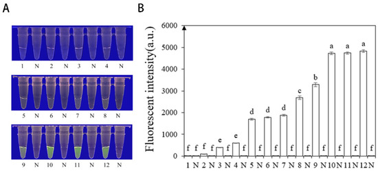 Optimization of the reaction concentration of CrRNA and ssDNA reporter based on INRA-310 RPA-CRISPR/Cas12a. (A) Observation of green fluorescence at 470 nm using a blue LED transmittance instrument; (B) detection of relative fluorescence intensity using a full-wavelength enzyme microplate reader. 1: 40 nM CrRNA, 40 nM ssDNA reporter. 2: 80 nM CrRNA, 500 nM ssDNA reporter. 3: 300 nM CrRNA, 1.4 nM ssDNA reporter. 4: 0.5 μM CrRNA, 2 μM ssDNA reporter. 5: 0.6 μM CrRNA, 5 μM ssDNA reporter. 6: 1 μM CrRNA, 5 μM ssDNA reporter. 7: 2 μM CrRNA, 5 μM ssDNA reporter. 8: 5 μM CrRNA, 5 μM ssDNA reporter. 9: 1 μM CrRNA, 10 μM ssDNA reporter. 10: 2 μM CrRNA, 10 μM ssDNA reporter. 11: 5 μM CrRNA, 10 μM ssDNA reporter. 12: 10 μM CrRNA, 10 μM ssDNA reporter. N: negative control (ddH2O: no green fluorescence). The one-way ANOVA of the fluorescence readings with those of the negative control showed that p < 0.0001 (different letters).