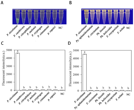 The specificity of Phytophthora nicotianae was rapidly detected with the RPA- CRISPR/Cas12a assay. (A,C) Evaluation using genomic DNA isolated from P. nicotianae (green fluorescence), P. cambivora (no green fluorescence), P. citrophthora (no green fluorescence), P. melonis (no green fluorescence), P. cryptogea (no green fluorescence), P. cinnamomic (no green fluorescence), P. capsica (no green fluorescence), and negative control (NC; ddH2O: no green fluorescence). (B,D) Evaluation using genomic DNA from P. nicotianae (green fluorescence), Py. Aphanidermatum (no green fluorescence), F. circinatum (no green fluorescence), Ph. Littorale (no green fluorescence), Ph. Helicoides (no green fluorescence), F. oxysporium (no green fluorescence), F. solani (no green fluorescence), and the negative control (NC; ddH2O: no green fluorescence). The one-way ANOVA of the fluorescence readings with those of the negative control showed that p < 0.0001 (different letters).
