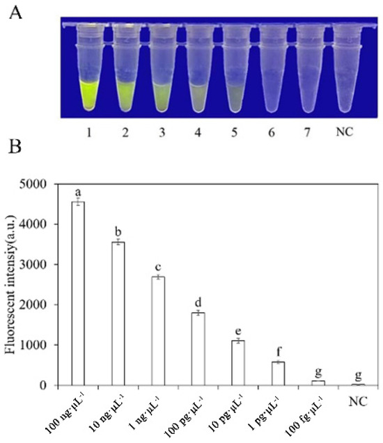 Analysis of the sensitivity of the RPA-CRISPR/Cas12a detection system. (A) Observation of green fluorescence at 470 nm using a blue LED transmittance instrument; (B) detection of relative fluorescence intensity using a full-wavelength enzyme microplate reader. 1–7: 100 ng·μL−1, 10 ng·μL−1, 1 ng·μL−1, 100 pg·μL−1, 10 pg·μL−1, 1 pg·μL−1, 100 fg·μL−1. N: negative control (ddH2O: no green fluorescence). The one-way ANOVA of the fluorescence readings with those of the negative control showed that p < 0.0001 (different letters).