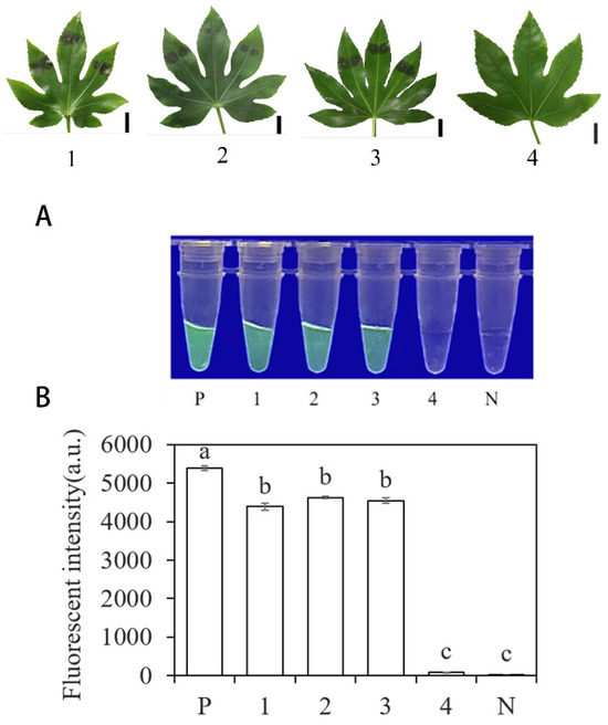 Detection of artificially inoculated actual samples using the system based on INRA-310-RPA-CRISPR/Cas12a. (A) Observation of green fluorescence at 470 nm using a blue LED transmittance instrument; (B) detection of relative fluorescence intensity using a full-wavelength enzyme microplate reader. P: positive control. 1, 2, 3: artificial inoculation of three strains of plant leaves with Fatsia japonica. 4: leaves of Fatsia japonica plants without inoculation. N: negative control (ddH2O: no green fluorescence). The one-way ANOVA of the fluorescence readings with those of the negative control showed that p < 0.0001 (different letters).