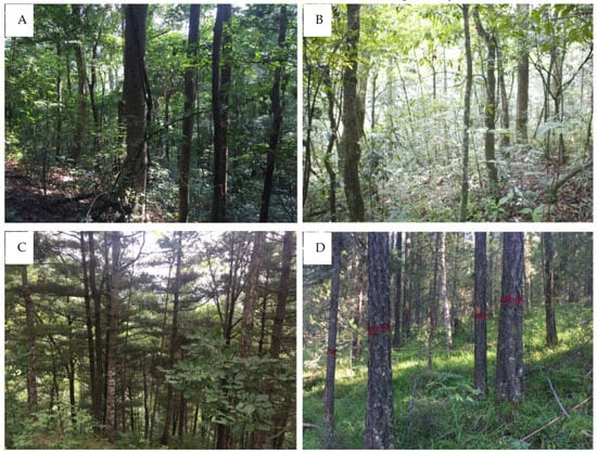 For the study, forest dynamics plots (FPDs) were established randomly within each of the four forest vegetation types, adhering to the standard methodologies of the Center for Tropical Forest Science (CTFS) [38] between April 2018 and July 2019. A total of 200 plots, each measuring 20 m × 20 m, were set up. Within each plot, every woody plant (trees and shrubs) with a DBH of 1 cm or greater was investigated, tagged, measured, and documented. This included the species identification, DBH, and coordinates within the plot. Identification of all the woody plant species was performed with assistance from local botanists, and the Latin scientific names were standardized according to the Flora of China (http://efloras.org/ (accessed on 1 December 2021)).
