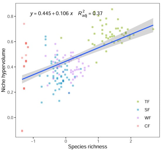 Relationship between functional niche space for woody plants in different forest vegetation types and species richness. Note: p value is less than 0.01. TF–tropical rainforest; SF–subtropical evergreen deciduous broad-leaved mixed forest; WF–warm-temperate coniferous broad-leaved mixed forest; CF–cold-temperate coniferous forest.