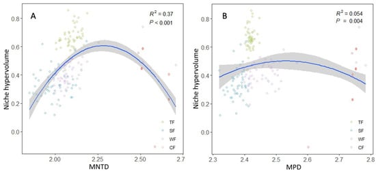 The community phylogenetic characteristics significantly influence the geographic differentiation of the FNH of woody plants in different forest vegetation types (Figure 3). The FNH in these forests showed a strong correlation with the MNTD of community species (Figure 3A, p < 0.001) and a significant correlation with the MPD of community species (Figure 3B, p < 0.05). Notably, the results showed that the MNTD had a more pronounced impact on the FNH across these vegetation types. The hypervolume exhibited a unimodal distribution with the changes in the MNTD, with a declining trend starting from the CF. In the TF, SF, and WF, the FNH significantly expanded as the MNTD increased. Conversely, in the CF, it decreased with an increase in the MNTD.