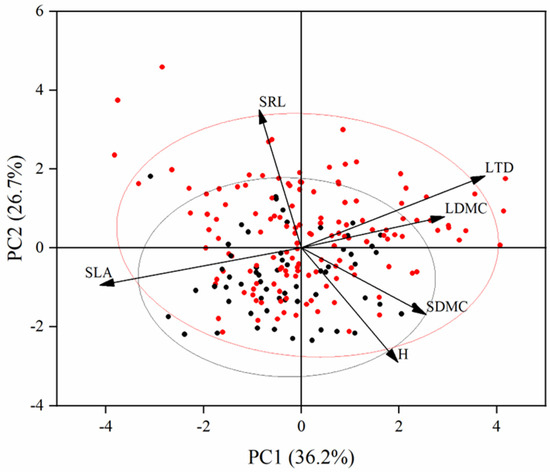 - Geng, Y.; Wang, L.; Jin, D.; Liu, H.; He, J.S. Alpine climate alters the relationships between leaf and root morphological traits but not chemical traits. Oecologia 2014, 175, 445–455. [Google Scholar] [CrossRef] [PubMed]