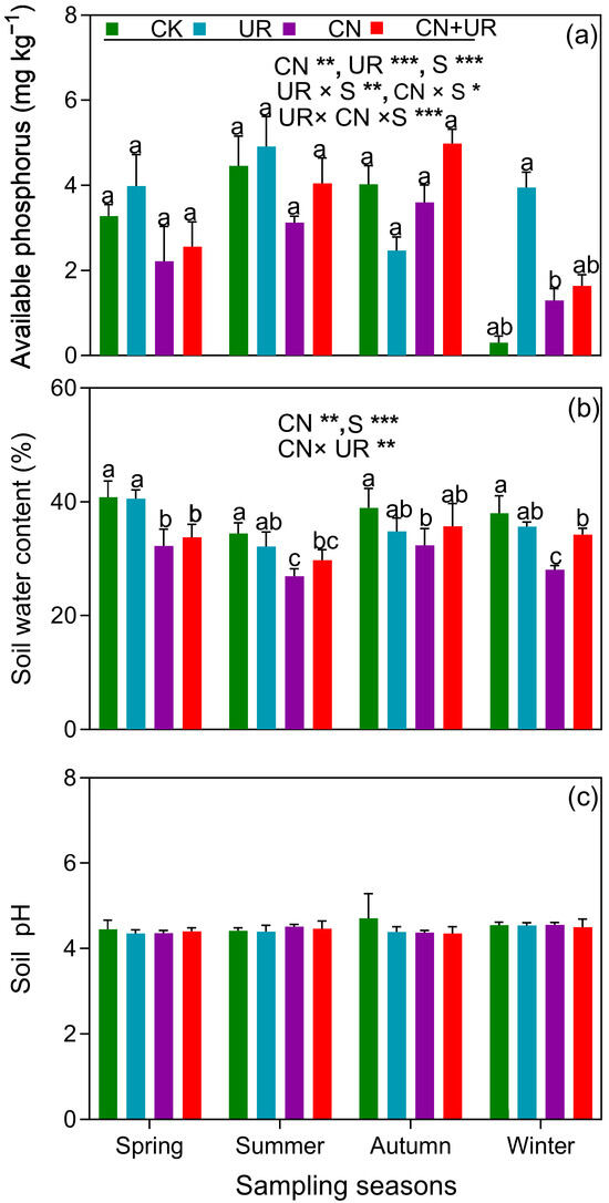 Concentrations of available phosphorus (a), soil water content (b), and soil pH (c) under different treatments. Data are presented as means ± SE. CK: control group, UR: understory removal, CN: canopy nitrogen addition, CN + UR: canopy nitrogen addition plus understory removal, S: season. The inserted significant values are derived from three-way ANOVAs. Different lowercase letters represent significant differences among treatments. *, **, and *** indicate the significance level of p < 0.05, p < 0.01, and p < 0.001.