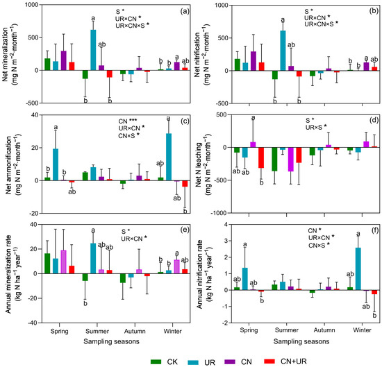The net mineralization and nitrification rates varied substantially between the seasons, with the highest impact observed during summer, particularly with UR treatment at 618 mg N m−2 month−1. CN showed rates of 294 mg N m−2 month−1 in the spring and 126 mg N m−2 month−1 in the winter. UR consistently displayed the highest values for both net mineralization and nitrification rates during the summer (Figure 3a,b). The interactions between CN and UR, as well as between UR, CN, and the season (S), significantly affected the in situ rates of net mineralization and nitrification.