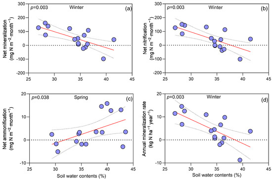 Relationships between the soil water content and nitrogen transformation processes: (a) net mineralization; (b) net nitrification; (c) net ammonification; (d) annual mineralization rate. The p values are indicated in the figures.