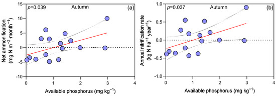 The regression analysis revealed significant relationships between the net ammonification and AP, as well as the annual nitrification rate and AP in the autumn season (Figure 5a,b), while all the other relationships of AP and pH with the remaining N transformation processes were found to be non-significant (Figures S2 and S3).