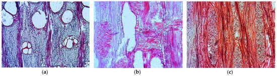 where a0, b0, and c0 represent the radial, tangential, and longitudinal dimensions of the dried specimens (in cm), respectively, means the density of wood substance (g/cm3), which is generally 1.54 according to Ugolev (1986) [22], and la and lb are the lengths of the waterlogged and dry wood (in cm).