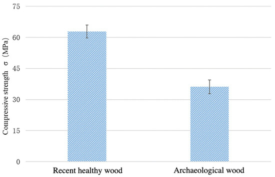 Comparison between the compressive strength (MPa) of recent healthy wood and archaeological wood samples.