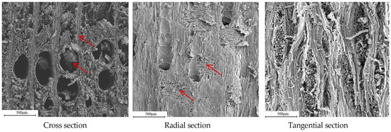 According to the scanning electron microscope images (Figure 3), the growth rings and vessels are clearly characterized on the cross section. Despite the accumulation of wood fragments within vessels, the cell lumens of the archaeological wood samples retain a relatively intact microscopic morphology. This suggests that the internal tissues have maintained a degree of mechanical strength sufficient to resist collapse during the drying process. The structural characteristics of the wood rays in the radial section remain discernible (the arrows), regardless of a noticeable relaxation in the arrangement of the wood fiber cells. The image of the tangential section reveals clearly identifiable fiber cells and rays, indicating that the level of deterioration in this wood sample has not reached a critically severe stage.