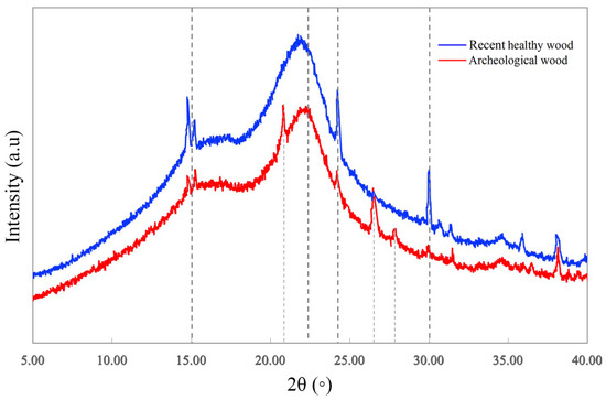 Figure 4 displays the X-ray diffraction patterns of both the AW and RHW, demonstrating essential similarities in their profiles. In the recent wood spectra, the characteristics peaks at 2θ = 15.2°, 22.2°, 24°, and 30° can be observed, corresponding to crystallographic planes of cellulose [47]. The XRD spectrum of AW presents additional diffraction peaks at 2θ = 21°, 26.7°, and 27.8°, which can be ascribed to crystalline compounds due to waterlogging. Notably, the diffraction intensity of the RHW is marginally higher than that of the AW, suggesting a decline in cellulose content in the AW samples used for analysis. According to the formula outlined in Section 2.5, the cellulose crystallinity of archaeological wood was determined to be 38.21%, which is slightly lower than the 42.46% found in recent healthy wood. These results indicate that the cellulose in the AW had become degraded to some extent [48,49].