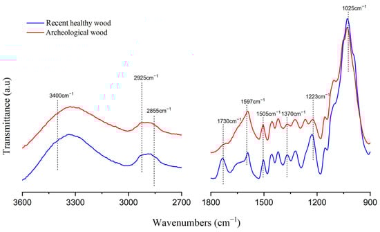 FT-IR spectra of archaeological wood and recent healthy wood.