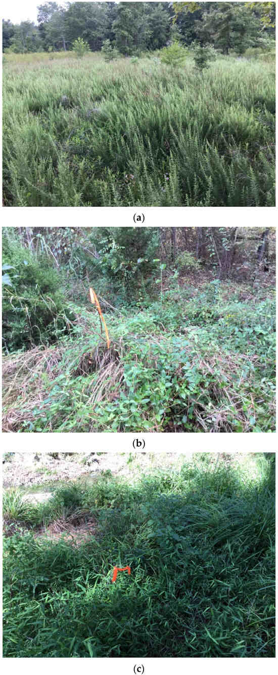 Representative photos of study species on stream restoration sites: (a) L. cuneata, (b) L. japonica, (c) M. vimineum.