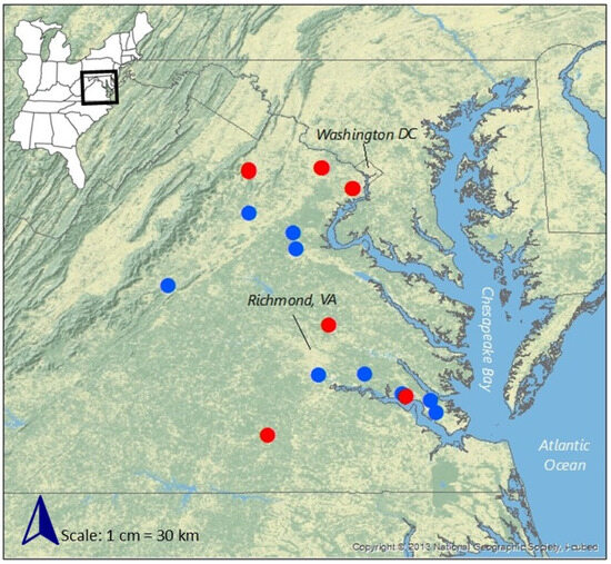 Representative field sites were chosen from a pool of 30 available sites in Virginia, USA, based on the following selection criteria: (1) the sites had to be non-tidal stream restoration projects developed under the purview of federal and/or state environmental laws, and (2) the sites had to have populations from our target list of invaders dominating at least portions of the project area. Field sites were assigned to the following age classes so that age could be evaluated as a factor: 1–2 years, 3–5 years, 6–10 years, 11–15 years, and >15 years following restoration [40]. Some of the stream restoration sites had different sections of the site that were restored at different times, correlating to the above age classes. These sections were treated as individual sites for sampling purposes if spatial or temporal separation was deemed sufficient, and the sections fell into different age classes.