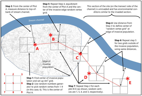 The first plot location (Plot A, completely invaded) was determined using the 4 m2 random vertex grid approach described by Hunter and DeBerry [2]. The distance from the center of Plot A to the top-of-bank of the stream channel was recorded, and this distance was used to define a new 4 m2 grid centered at the edge of the invasive species population and offset the same distance from the channel bank. A third grid was established using the same offset distance from the stream bank, but this time within the invasive species population and equidistant from the center of Plot A and the center of the invasive edge grid. Using these same distances, the last two 4 m2 grids were laid out at the uninvaded end of the transect. For each of the remaining plots (B, C, D, and E), random numbers between 1 and 9 were drawn to determine which vertex on each respective grid would be the center of each plot (Figure 4). This process ensured that all five plots along the invasion gradient were approximately the same distance from the channel (+/−1 m), with the exact location of each plot being randomized. The transects ranged in length from 30 to 100 m.