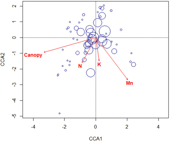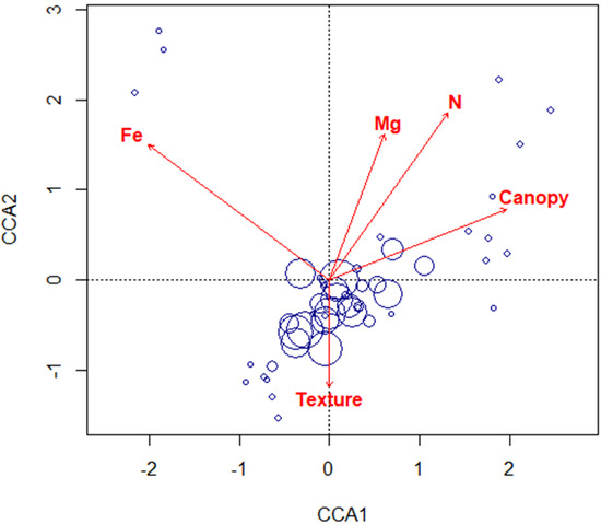CCA biplot for L. cuneata dataset. Red arrows are vectors for environmental variables. Vector length indicates strength of correlation, and vector direction indicates a positive (pointing toward) or negative (pointing away) relationship to the plots, which are shown as circles with size corresponding to abundance of L. cuneata (i.e., larger circles = higher abundance). Plot relationships with environmental vectors are interpreted as perpendicular projections from blue circles to red arrows.