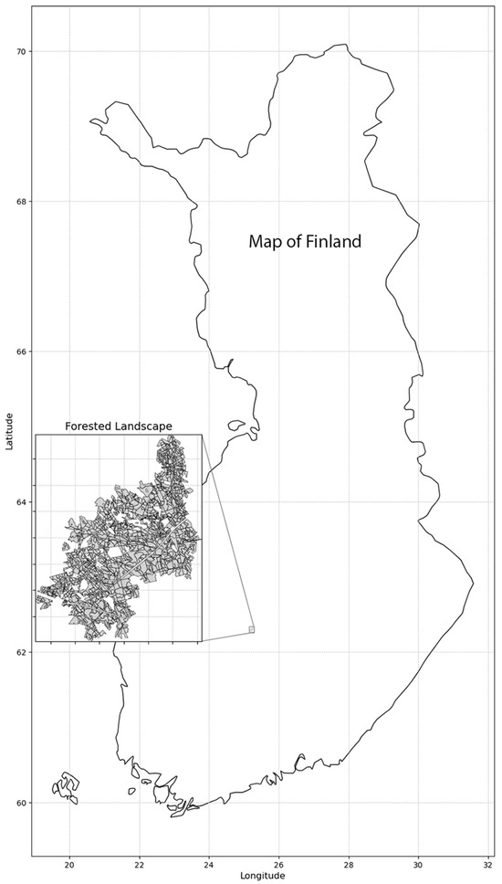 The simulated forested landscape, 2250 hectares across 1458 stands, privately owned and located in southern/central Finland.