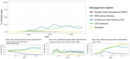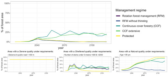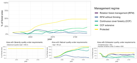 Proportion of the landscape that fulfils the Mixed salutogenic forest characteristic (SFC) over time, when the whole landscape is managed according to a specific management regime. Small figures represent the proportion of the landscape that fulfils the perceived sensory dimensions (PSDs) required for a Mixed SFC to emerge.