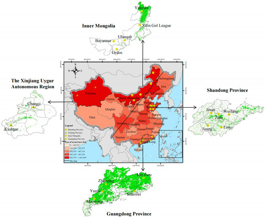 As shown in Figure 1, the colors from dark to light represent the outbreak areas of FBDs by province. In the western region, the provinces of Xinjiang and Inner Mongolia were selected for the highest area of FBDs. Both are also the main epidemic areas for rodents (hares). In the east, Shandong Province, with a high outbreak area, was chosen. Shandong is the main epidemic area for Hyphantria cunea, while Bursaphelenchus xylophilus has also occurred frequently there in recent years. Guangdong Province was selected due to its high incidence of Bursaphelenchus xylophilus. It is also a major epidemic area for Mikania micrantha [39]. This research mainly focuses on the outbreak of overall FBDs in all collective forest land owned by farmers.