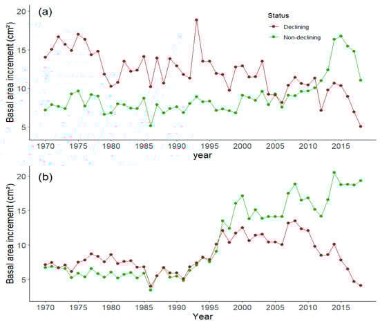 Average basal area increment of non-declining (green) and declining (red) trees from 1970 to 2018 at study sites (a) Cotatuero and (b) Paco Ezpela.