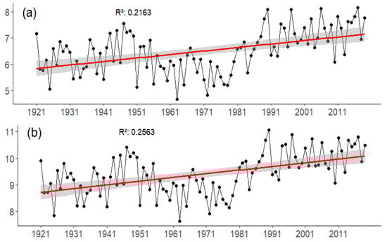 Trend of annual mean temperature 1921–2018 in study area (a) Cotatuero and (b) Paco Ezpela. The red line represents a linear trendline.