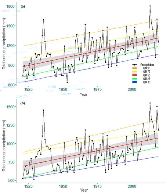 Trend of precipitation in study area in (a) Cotatuero and (b) Paco Ezpela. The lines represent different quantile regression lines.