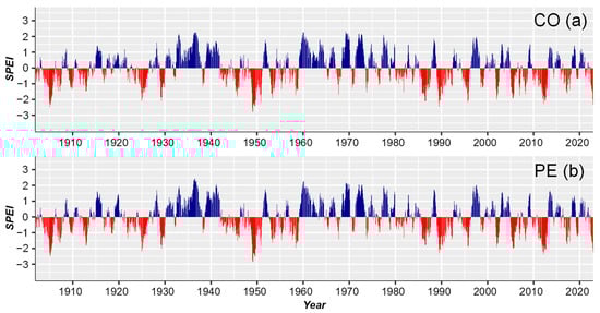 Precipitation, temperature, and SPEI were downloaded from the Koninklijk Nederlands Meteorologisch Instituut Climate Explorer website (https://climexp.knmi.nl, accessed on 10 May 2024) with a spatial resolution of 0.25°, utilizing the coordinates listed in Table 1 that correspond to the study areas.