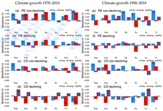 The population-level climate–growth sensitivity, estimated for the time span 1970–2018 (Figure 5a–d), indicates that non-declining trees from PE had positive correlations with precipitation and temperature for almost all seasons, as well as at the annual scale (Figure 5a); in contrast, non-declining trees from CO only showed a positive correlation with the precipitation of the previous summer (Sup), current summer (Su) and the total annual precipitation (Yr) (Figure 5c). Non-declining trees from PE also exhibited a positive sensitivity to temperature (Figure 5a). Declining trees from PE (Figure 5b) and CO (Figure 5d) differed, the negative influence of temperature being more evident in CO.