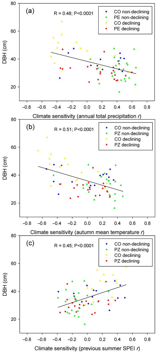 Overall, our study provides valuable insights into the complex interactions between tree characteristics, climate sensitivity, and growth trends in silver fir populations. These findings contribute to our understanding of forest dynamics under changing climatic conditions and highlight the importance of considering tree-level responses to climate variability in forest management and conservation efforts.