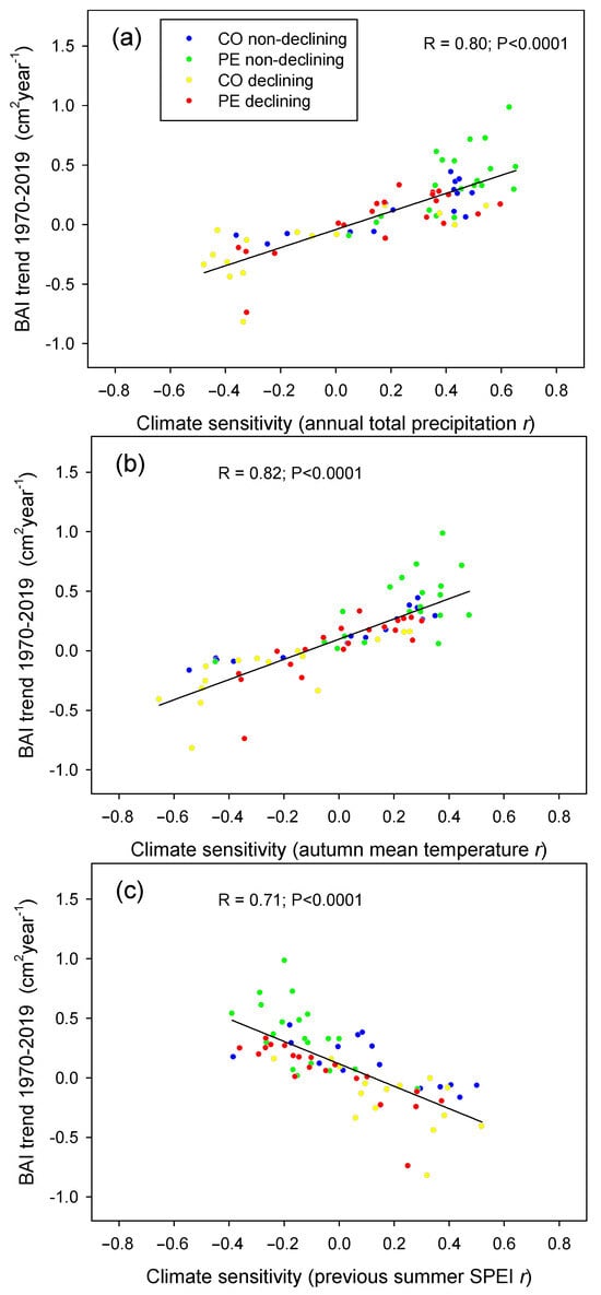 The tree-level BAI trend was estimated as the slope of the linear regression of BAI and the calendar year. Tree-level BAI climate-sensitivity was estimated as the Pearson correlation coefficient of the BAI and seasonal climate variables estimated from the summer prior to the year of tree-ring formation to the current autumn. We performed these analyses for the time periods 1970–2018 and 1990–2018.