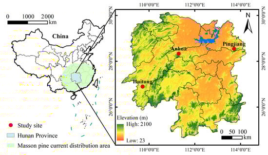 This study utilized three Masson pine sites that were established in Pingjiang, Anhua, and Huitong in Hunan Province, China (Figure 1; Table 1). These sites experience a humid subtropical climate with a hot summer, and the average daily temperatures range from 4.2 °C in January to 30.5 °C in July. The mean annual precipitation is between 1300 and 1800 mm, and 60%–70% of the precipitation falls during the growing season (April to September). Average daily solar radiation in the growing season is between 14.5 and 16.5 MJ/m2. The soils of the three sites are classified as a mountain yellow-red soil derived from granite parent material, with an average pH ranging from 4.7 to 5.9. The soil has a shallow A horizon (approximately 20 cm), but the soil profile extends from 100 cm to more than 150 cm in depth before reaching fractured granite bedrock.