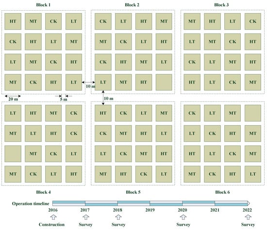 The experiment was conducted in a completely randomized block design with subsampling. Six blocks (replicates) were established adjacent to each other in reasonably uniform stand conditions in Pingjiang. Four blocks were established in Anhua and Huitong, respectively. Each block was repeatedly subdivided into four rows of rectangular subsampling units. Each subsampling unit was randomly assigned four treatment plots (20 m × 20 m): heavy thinning (HT, 35%–45% of the trees by number were removed), moderate thinning (MT, 25%–35% of the trees by number were removed), light thinning (LT, 10%–25% of the trees by number were removed), and control (CK). A total of 214 plots were established, including 93 in Pingjiang, 60 in Anhua, and 61 in Huitong. For instance, the schematic diagram of the experimental treatments in the Pingjiang field trial is shown in Figure 2.