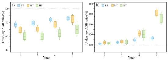 Thinning treatments can promote the growth and biomass of retained trees, but additional analysis is needed to understand their impact on the overall AGB of the stand. The short-term accumulation of retained tree biomass is not enough to make up for the biomass removed during thinning []. For example, in the first year, the post-treatment AGB of the overstory in the plots was noticeably lower than that of the CK, and the reduction expanded as the thinning intensity increased (Figure 3a). However, as thinning-induced biomass increment was released over time, the AGB difference between thinned plots and CK decreased. Thus, the positive effects of thinning treatments on biomass increment were evident in later years. In year 6, MT exhibited the highest average overstory biomass increment at 9.72 Mg·ha−1·a−1, significantly higher than both LT (7.71 Mg·ha−1·a−1) and HT (7.84 Mg·ha−1·a−1) (Figure 4a). Coupled with its moderate initial retained biomass, this resulted in the overstory AGB under MT exceeding that of other thinning treatments and approaching that of CK. Similarly, MT showed the highest average understory biomass increment at 1.43 Mg·ha−1·a−1 in year 6, followed by HT at 1.21 Mg·ha−1·a−1 and LT at 0.42 Mg·ha−1·a−1 (Figure 4b). The results indicated that while thinning initially reduced AGB in the overstory, it subsequently enhanced biomass increments in both the overstory and understory. MT provided the most significant benefits in later years.