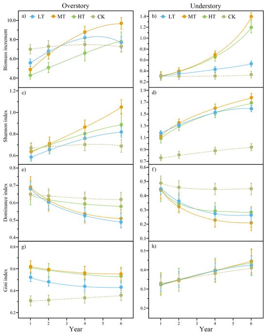 Furthermore, tree growth changed significantly in biomass increment, Shannon index, Dominance index, and Gini index over time (Figure 4 and Table 4). The overstory biomass increment followed a temporal dynamic reflective of regeneration development, with the maximum mean value occurring in the CK during the early years and in thinned plots during the later years (Figure 4a and Table 4). For example, the maximum mean overstory biomass increment was observed in the CK at 7.03 Mg·ha−1·a−1 in year 1, while it was observed under MT at 9.72 Mg·ha−1·a−1 in year 6. The understory biomass increment consistently remained higher than those in the CK, with this advantage becoming increasingly apparent over time (Figure 4b). The Shannon index in the two strata showed similar biomass increment patterns over time, with thinned plots gradually exceeding the CK (Figure 4c,d). Furthermore, thinning generally reduces the Dominance index for both overstory and understory (Figure 4e,f) while also having a positive effect on the Gini index for the overstory (Figure 4g).