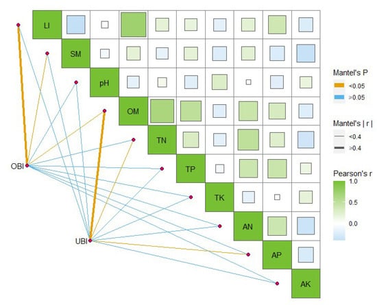 Biomass increments of overstory and understory were related to each factor by Mantel tests. Edge width corresponds to the Mantel’s r statistic for the corresponding correlations, and edge color denotes the statistical significance based on 10,000 permutations. Pairwise comparisons of environmental factors are shown, with a color gradient denoting Pearson’s correlation coefficients. Abbreviations: OBI, overstory biomass increment; UBI, understory biomass increment; LI, light intensity; SM, soil moisture; pH, soil pH; OM, soil organic matter; TN, total nitrogen; TP, total phosphorus; TK, total potassium; AN, available nitrogen; AP, available phosphorus; AK, available potassium.